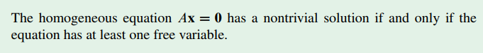 위의 Existence and Uniqueness of Solution for Linear systems 에서 consistent한 linear system에서 free variable이 없으면 하나의 유일한 솔루션만 있다고 했으니, 이 경우 homogeneous system은 x = 0 이 되며, 따라서 homogeneous system 이 non-trivial 한 솔루션을 가지려면 free variable이 있어야 하겠다.